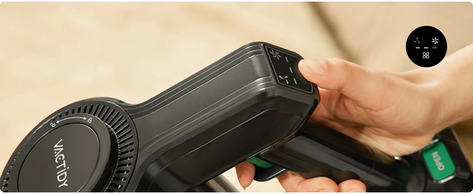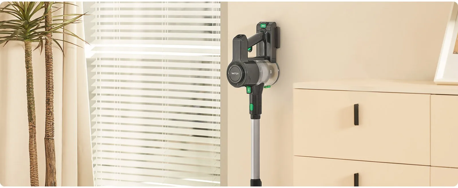 Thanks to the reportable battery, the V9 cordless vacuum cleaner can deliver excellent cleaning performance for up to 45 minutes in low suction mode. The operating time may vary depending on the environment at home.