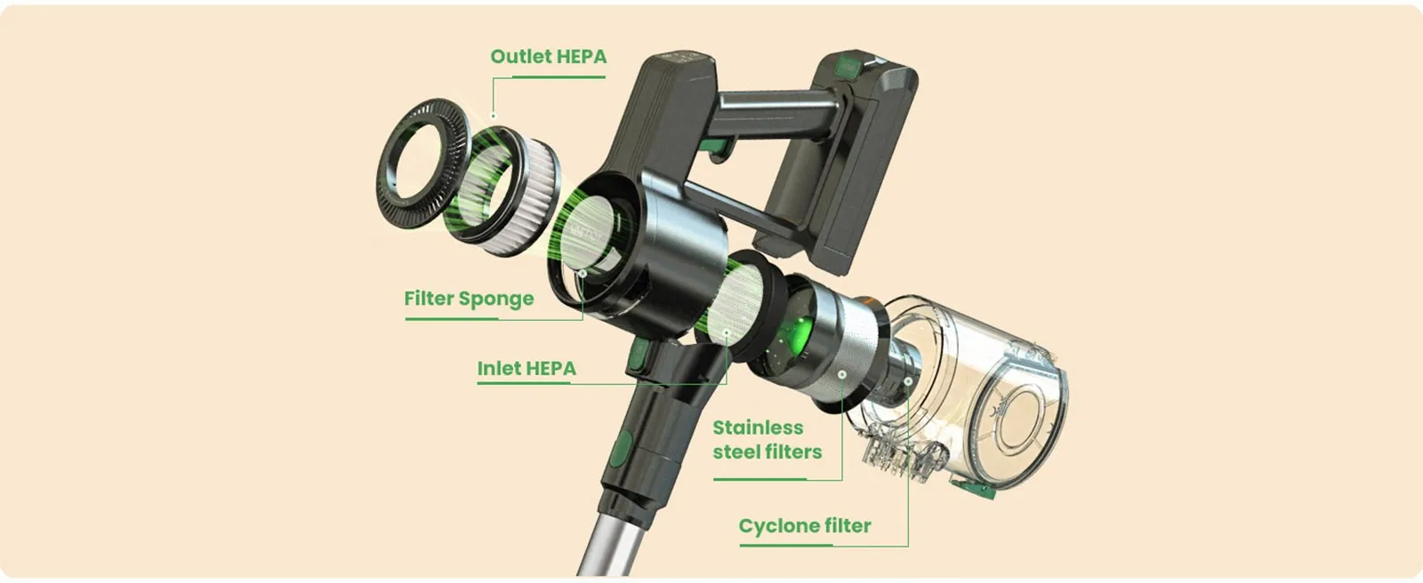 Its highly efficient filter system cleans up to 99.97% of microscopic dust articles that are only 0.3 microns. The V9 wireless vacuum cleaner has a paved cyclone filter system that provides you with an ideal living environment and prevention secondary air pollution. The filter floss can be reused after cleaning.
