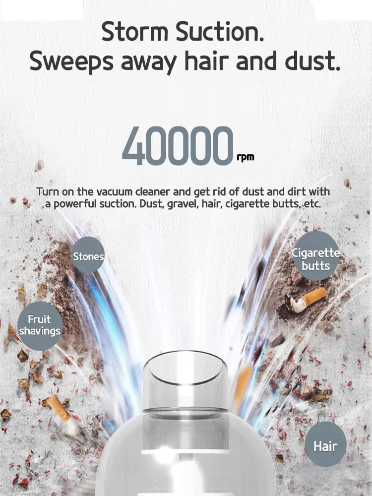 The car handheld vacuum cleaner can easily clean pet hair on the sofa, food residue on the table, kitchen debris, table and keyboard dust, etc. It is also a good product for car cleaning. Long flat nozzle and brush head are suitable for narrow angle and fabric surface respectively.